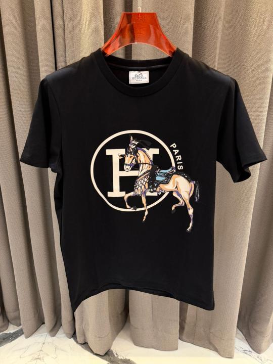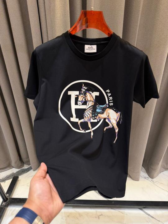 Home T-Shirts Hermes Middle Brand Print Round Neck T-shirt Black