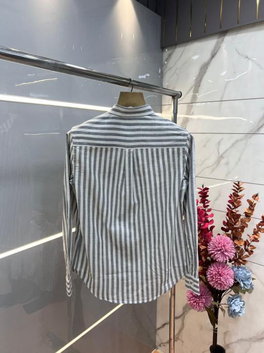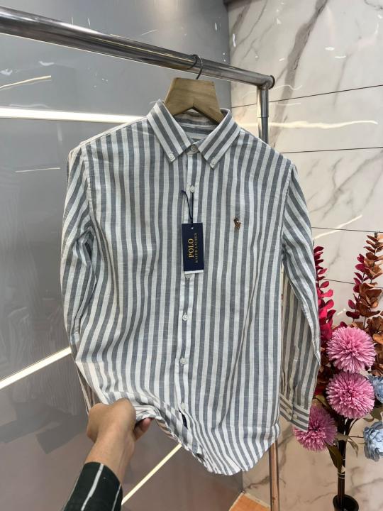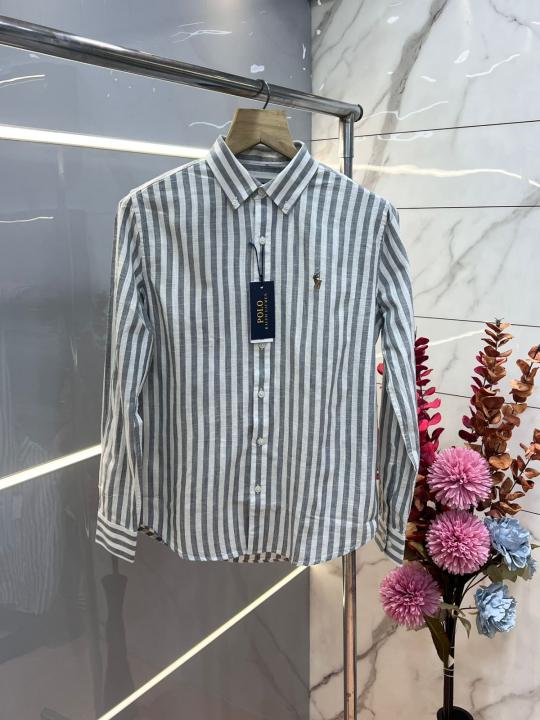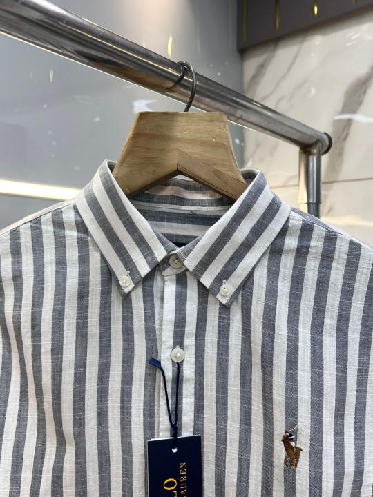 Home Shirts Ralph Laure n GREY Premium Imported Cotton Linen Fabric Shirt with Strips and Embroidered Logo 3637